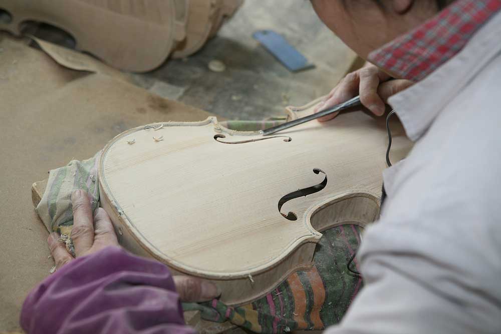 laminated top, back and sides; fully arched | hand carved maple neck and scroll | ebony fingerboard | adjustable bridge | Rubner machines